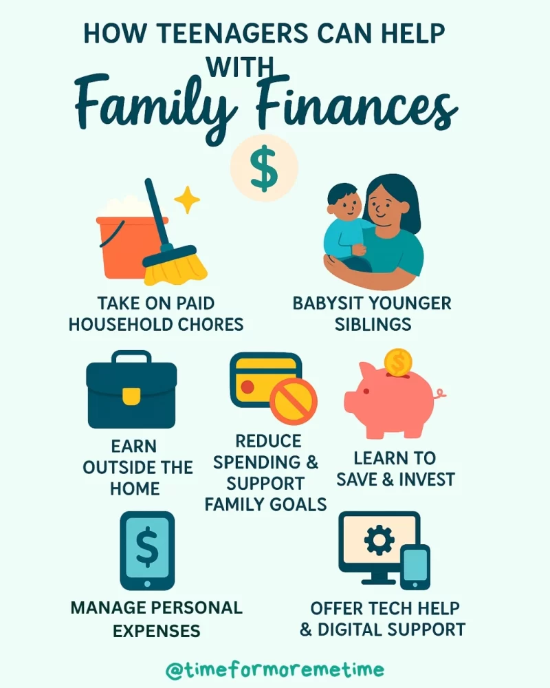 Teens don’t need a full-time income to make a real difference at home. From helping with chores and childcare to managing their own spending and using tech skills to support family goals, there are plenty of simple ways they can contribute. These small actions add up—teaching lifelong habits while easing daily expenses.
