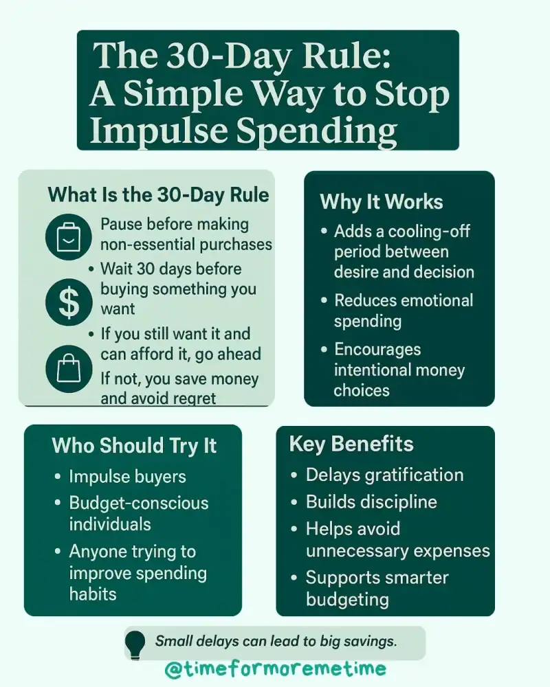 The 30-day rule is a simple way to pause, reflect, and make smarter financial choices. By creating space between the urge to spend and the decision to buy, you can avoid impulse purchases and protect your long-term goals.