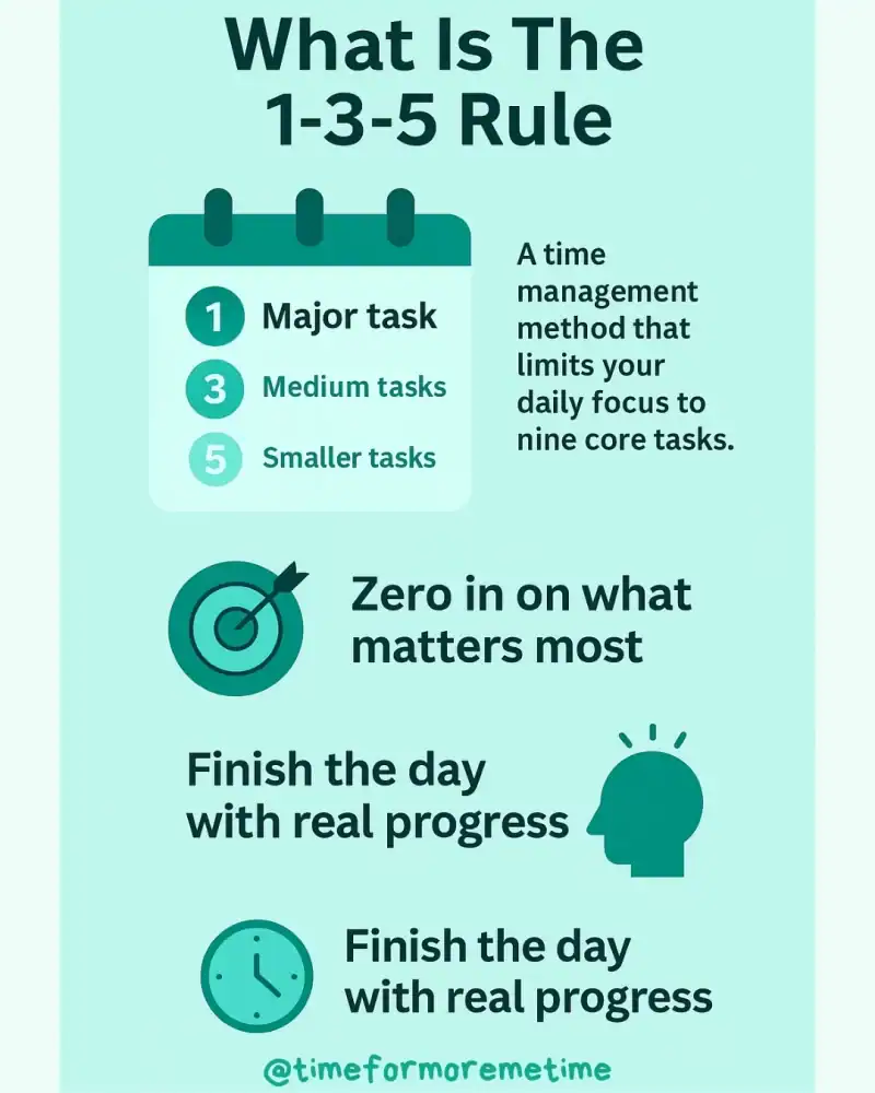 The 1-3-5 rule is a powerful yet simple way to save time, prioritize what matters, and feel in control of your day. With just one big task, three medium ones, and five small ones, you create structure without stress. It’s a time-saving habit that turns chaos into clarity and intention into action.