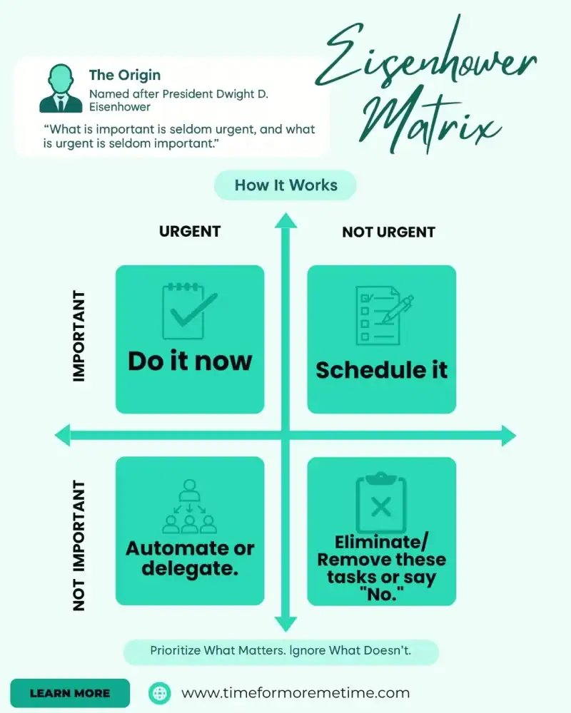 The Eisenhower Matrix, often referred to as the urgent-important matrix, is a decision-making tool named after former US President Dwight D. Eisenhower. He famously stated, “What is important is seldom urgent, and what is urgent is seldom important.”