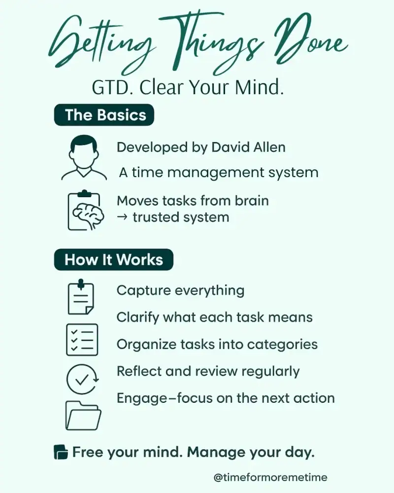 GTD is a practical and powerful time management method that helps you stay organized, reduce stress, and focus on what matters most. By capturing and sorting your tasks into a clear system, you can free your mind, avoid overwhelm, and make steady progress every day.