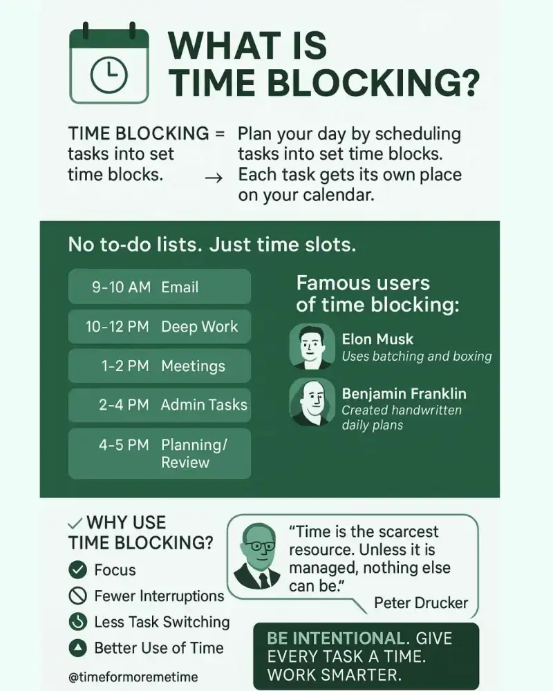 Fun fact: Elon Musk effectively manages his busy schedule by using time blocking techniques, specifically time batching and timeboxing. Similarly, Benjamin Franklin utilized a more informal version of time blocking by creating handwritten schedules to organize his daily tasks.