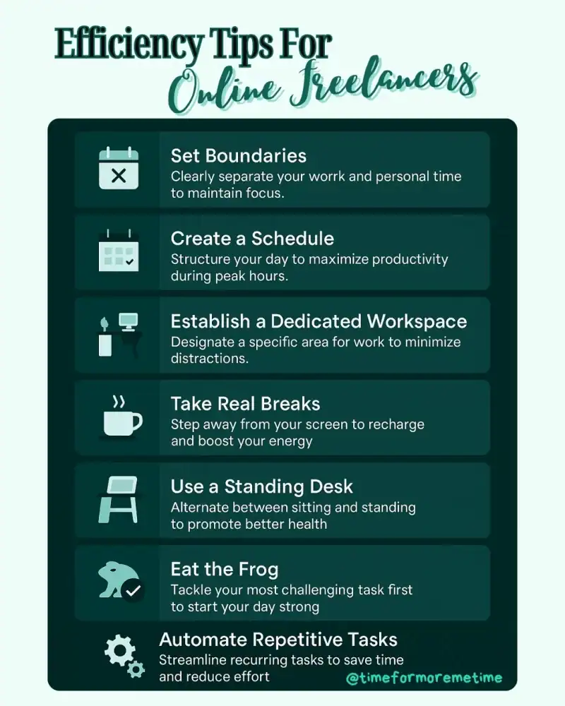 Mastering these efficiency tips for online freelancers can be challenging at first, especially if you’re just starting out. If you’re a seasoned freelancer, you likely already know these strategies, but a little reminder can go a long way. After all, maintaining the discipline to consistently apply these tips can be tough!