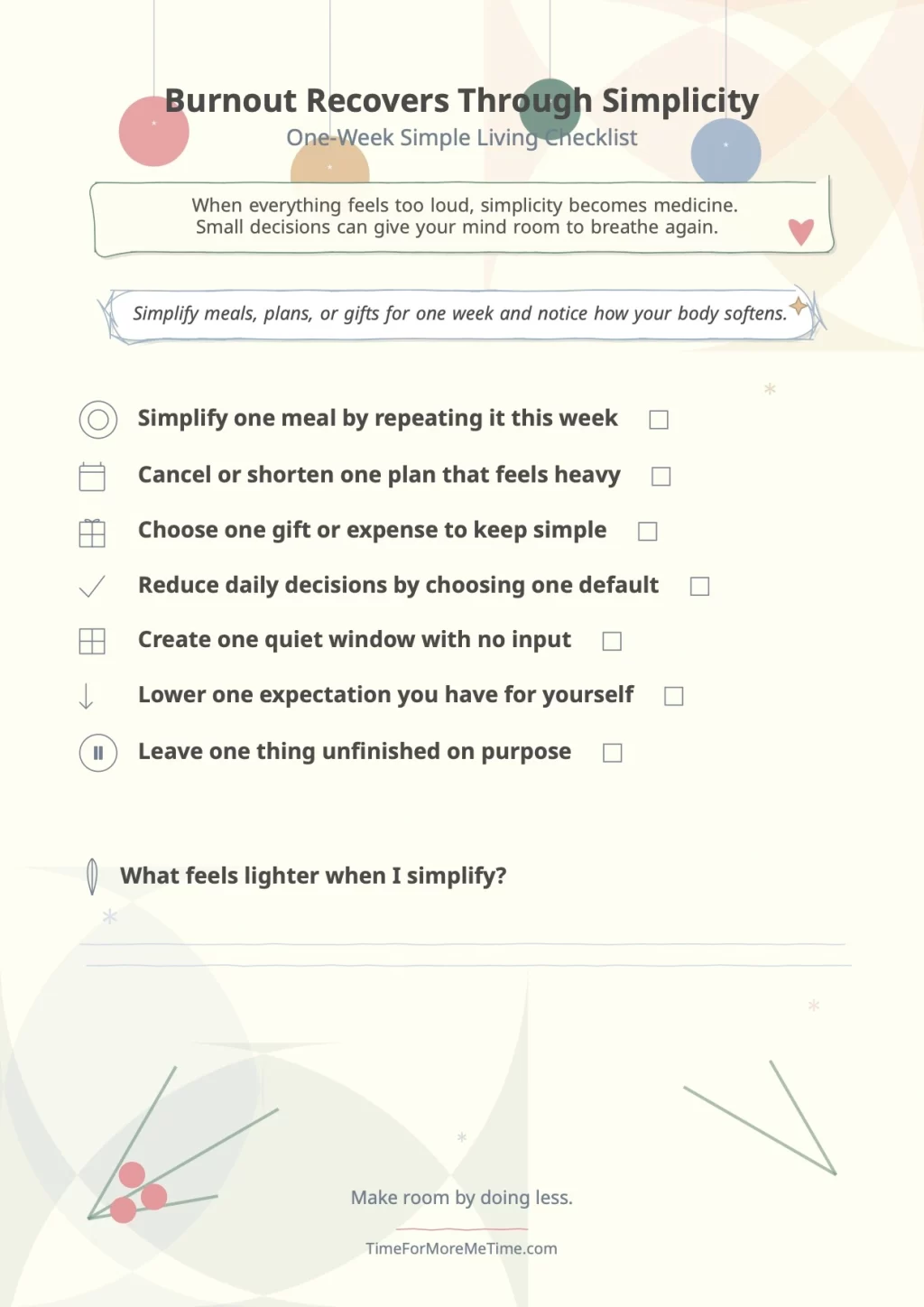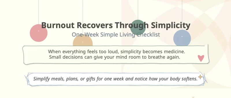 Burnout often improves through less pressure, fewer decisions, and smaller commitments. With this free checklist, you can simplify meals, plans, and daily choices for one week so your body can soften again.